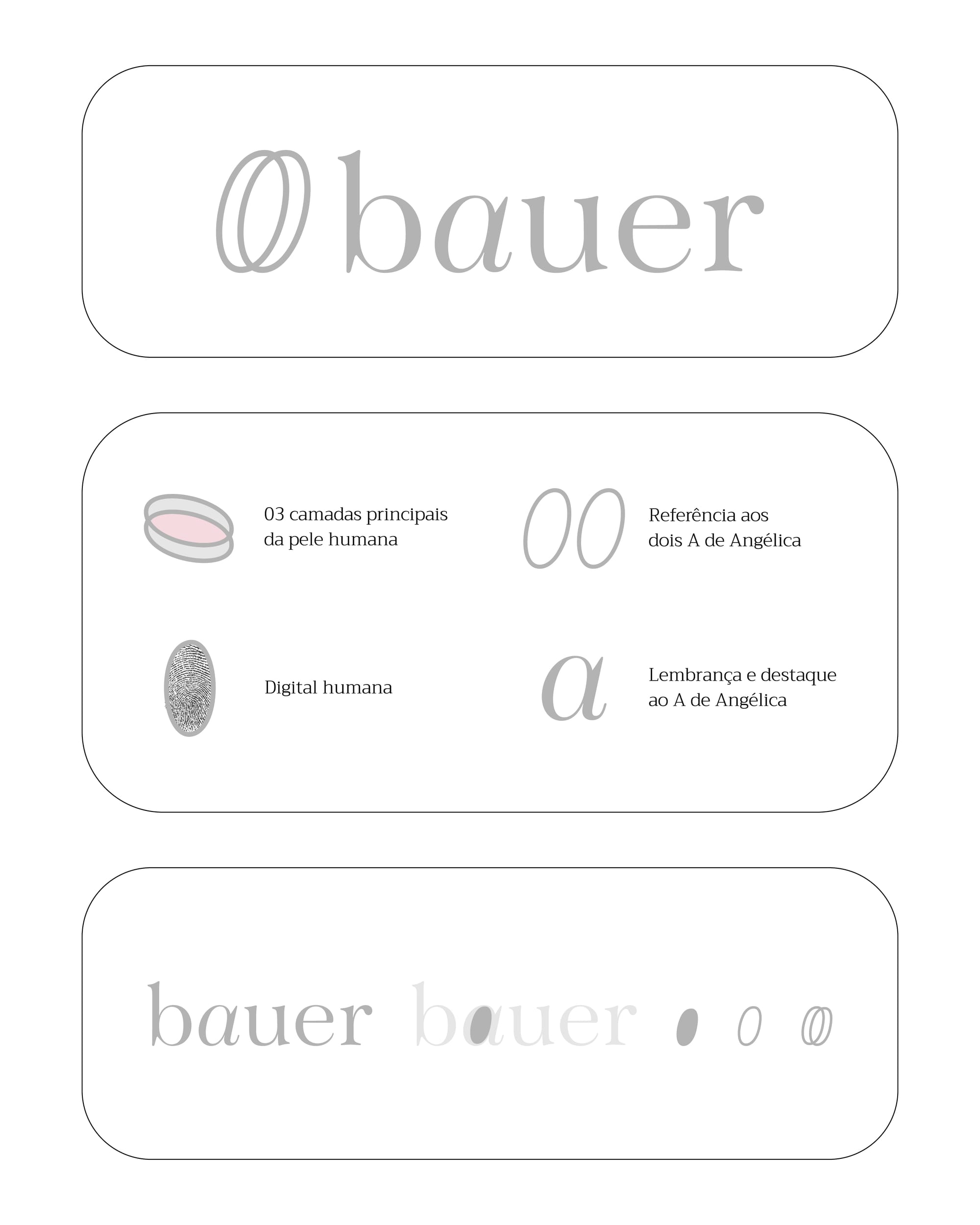 O símbolo da marca é discreto, mas repleto de significado. Ele é derivado da contraforma da letra "A" de Angélica, destacada em itálico para simbolizar singularidade e movimento. Essa forma reflete a pureza e a autenticidade do cuidado oferecido pela Bauer, enquanto evoca precisão e atenção meticulosa aos detalhes, elementos fundamentais na prática dermatológica.