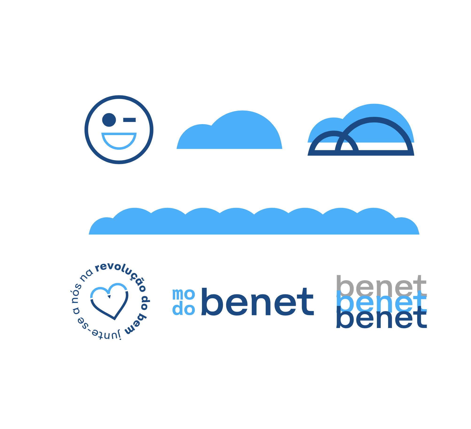Com a estratégia bem definida, estávamos prontos para desenhar a nova identidade visual. O objetivo era construir uma marca moderna, com uma arquitetura robusta e preparada para um futuro promissor. Queríamos que essa identidade refletisse o orgulho de tudo o que a Benet já conquistou e demonstrasse um forte desejo de evolução. Um dos pontos mais debatidos durante o processo foi a presença das nuvens, um elemento icônico da marca anterior. Deveriam elas ficar ou não? Após extensas pesquisas e dinâmicas, ficou claro que a resposta era sim: a nuvem deveria permanecer.