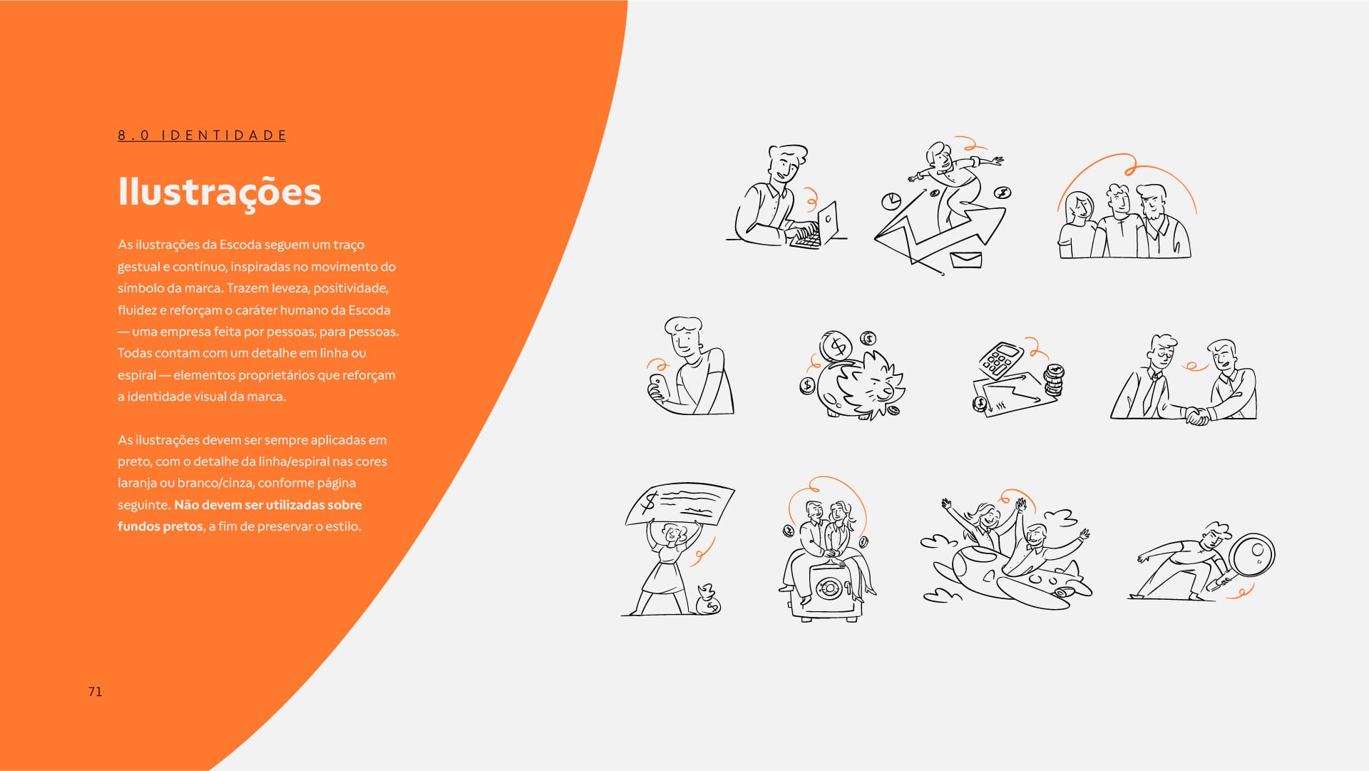 Assim nasceu o laranja Escoda (Orange Coda), uma cor vibrante e acolhedora que expressa movimento, calor humano e inovação. Associada a tons neutros de cinza e ao preto, essa paleta garantiu contraste e personalidade próprias, afastando‑se visualmente de outras marcas próximas e do setor.