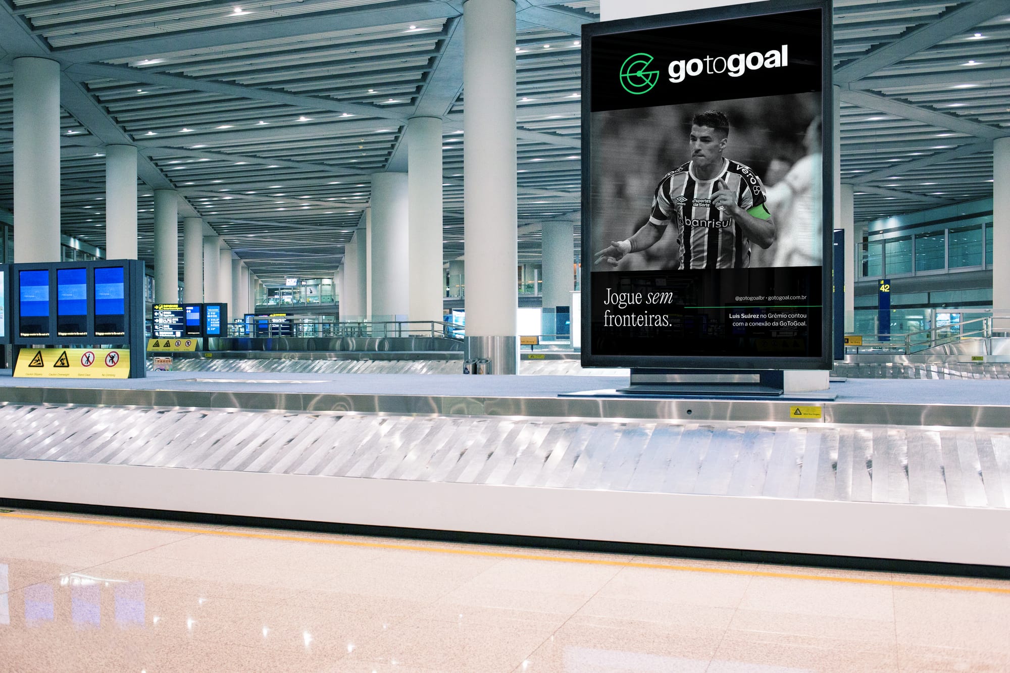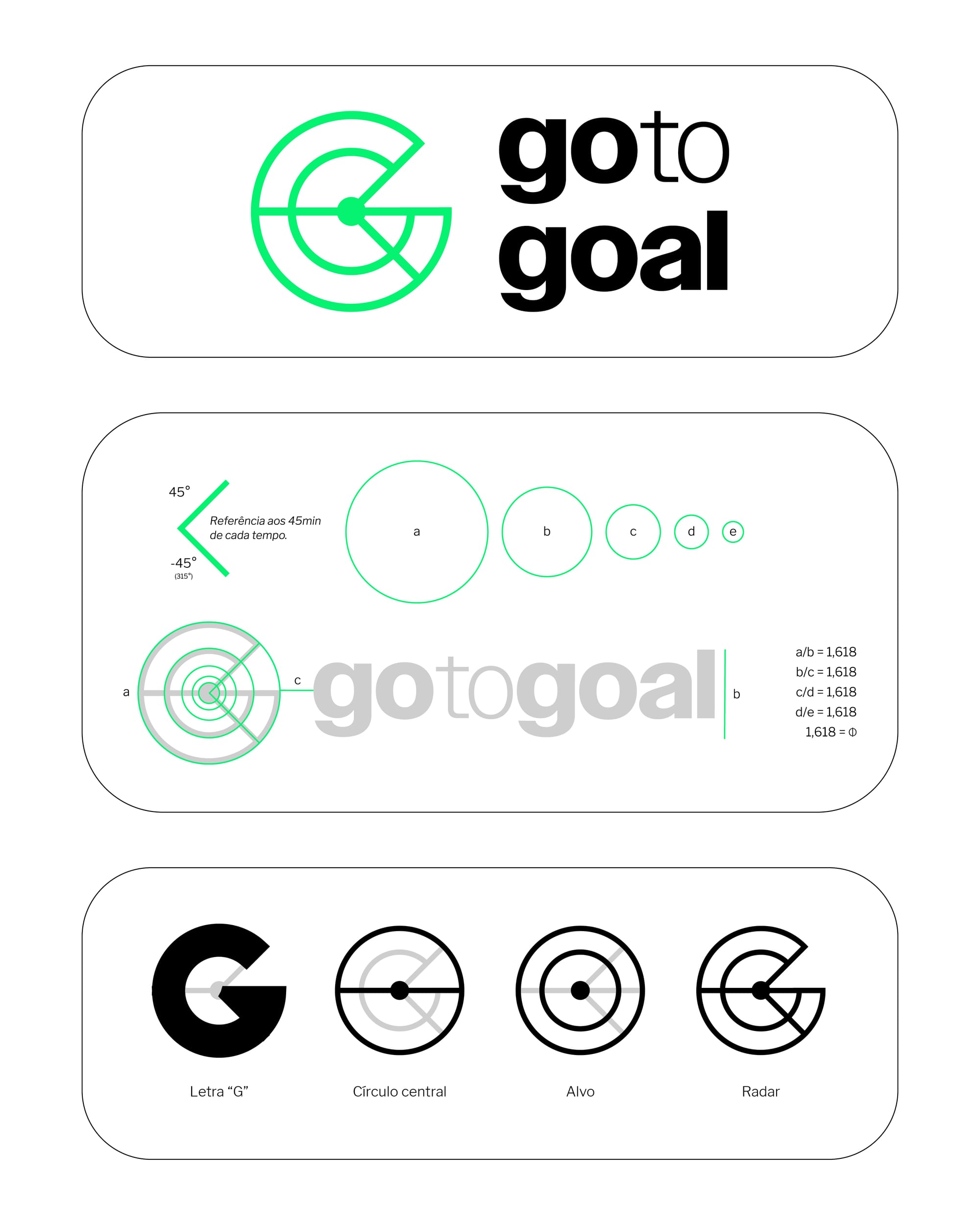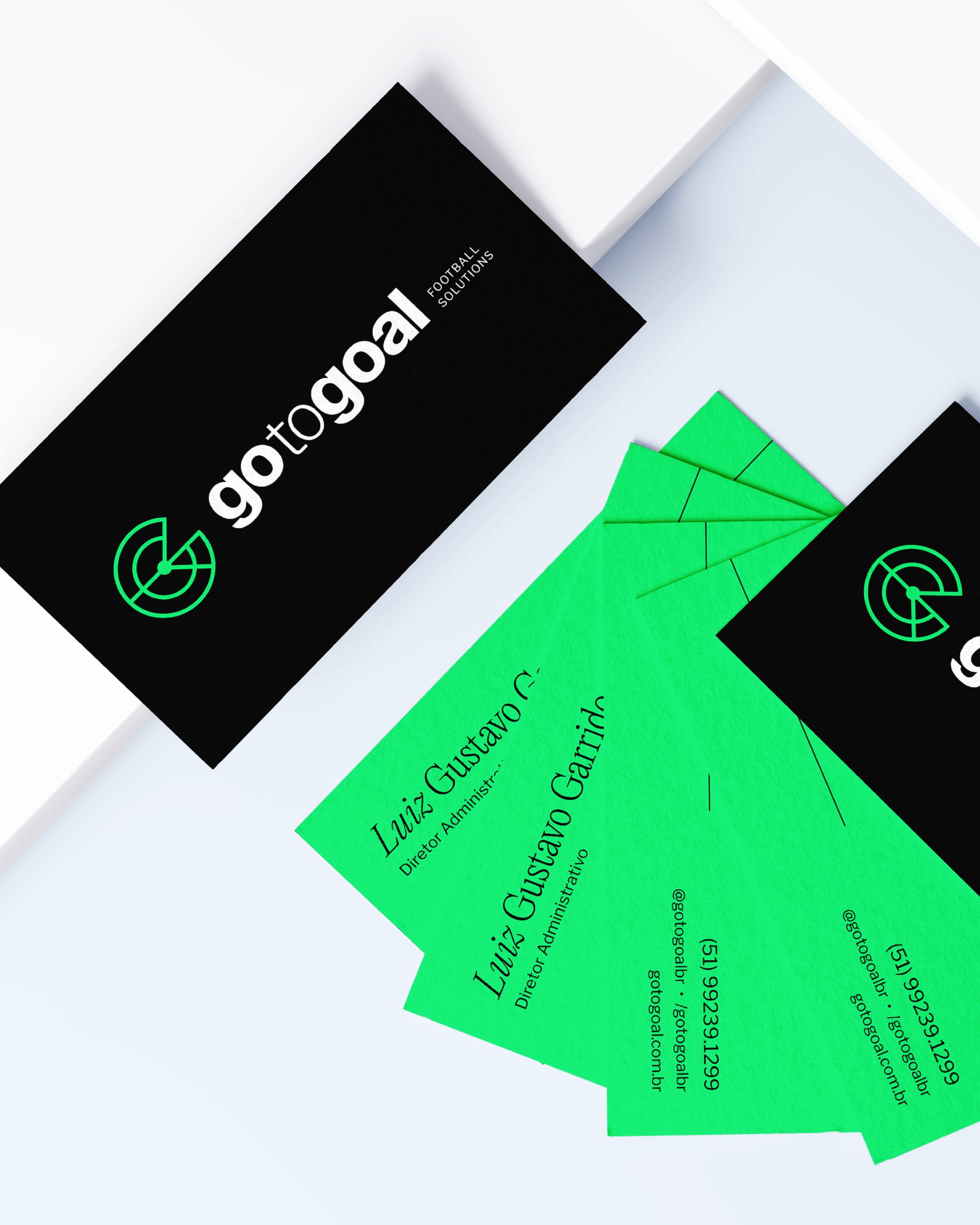 A identidade visual da marca reflete a visão e os valores da empresa, com uma estética proprietária que equilibra presença marcante e discrição, permitindo que a verdadeira essência do futebol se destaque. Para isso, desenvolvemos um logo que retrata o meio de campo de forma única, agregando novos significados. O símbolo carrega a essência do futebol enquanto evoca a assertividade das iniciativas (alvo) e a constante busca por soluções ideais (radar), além de remeter ao 'G' do nome da marca.