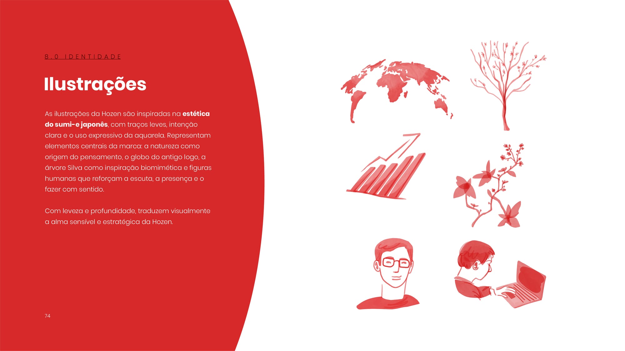 Para humanizar ainda mais a identidade, desenvolvemos uma série de ilustrações inspiradas na estética sumi‑e japonesa, com traços leves e uso expressivo de aquarela. Elas representam elementos centrais da marca: a natureza como origem do pensamento, o globo do antigo logo, a árvore Silva como inspiração biomimética e figuras humanas que reforçam a escuta e a presença.