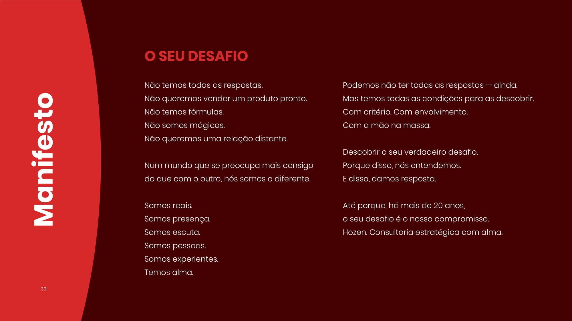 Foi esse amadurecimento que motivou o reposicionamento completo de marca conduzido pela A27. A nova Hozen precisava refletir o que ela já era na prática: uma consultoria sénior que escuta com atenção, pensa com critério e entrega com presença.