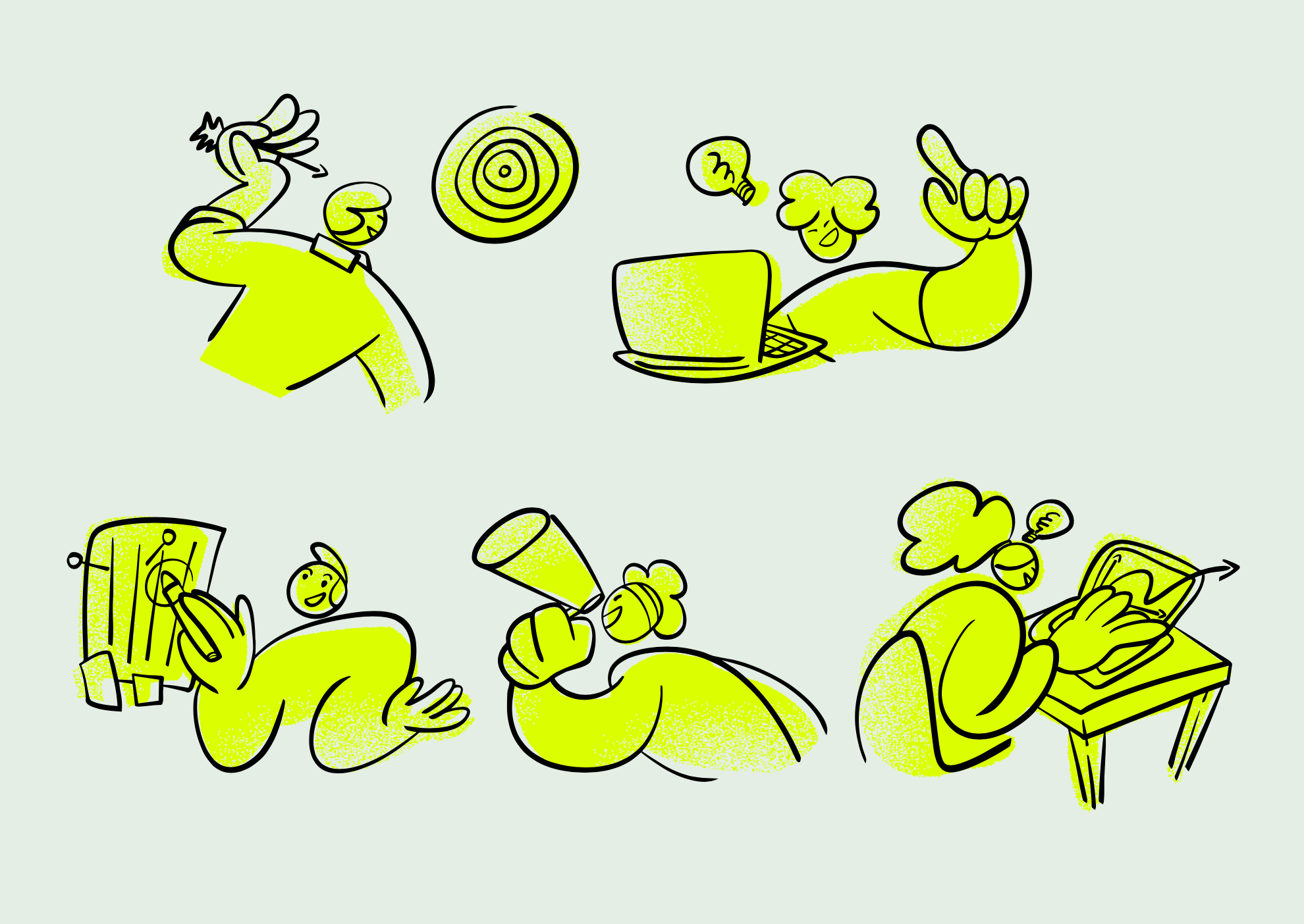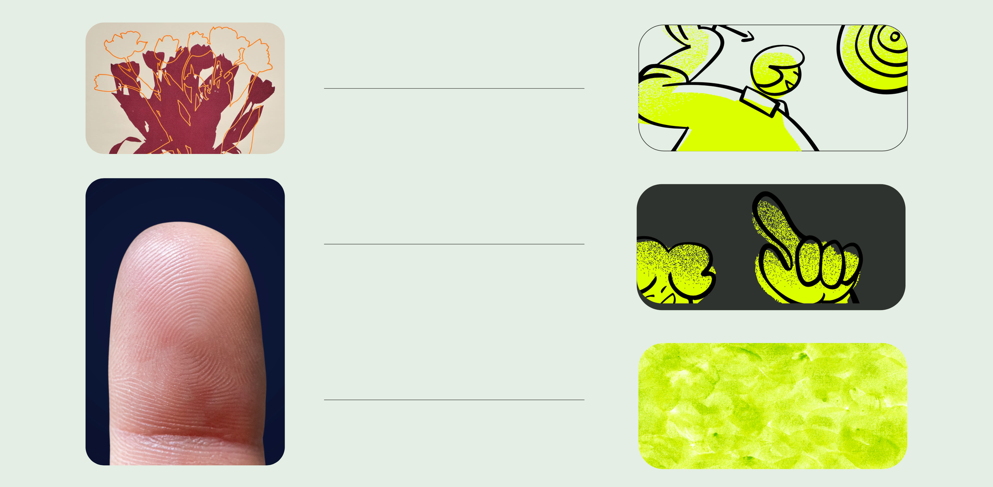 As ilustrações seguem o mesmo espírito: traços gestuais, expressivos e fluidos, como se tivessem sido feitos à mão. O preenchimento deliberadamente deslocado, inspirado na obra da artista Lourdes Castro, cria camadas visuais inesperadas, enquanto um granulado sutil remete à passagem do tempo. As mãos e dedos são protagonistas, representando o fazer humano, o toque, o gesto, e o sorriso reflete a alegria que faz parte da essência da Martech.