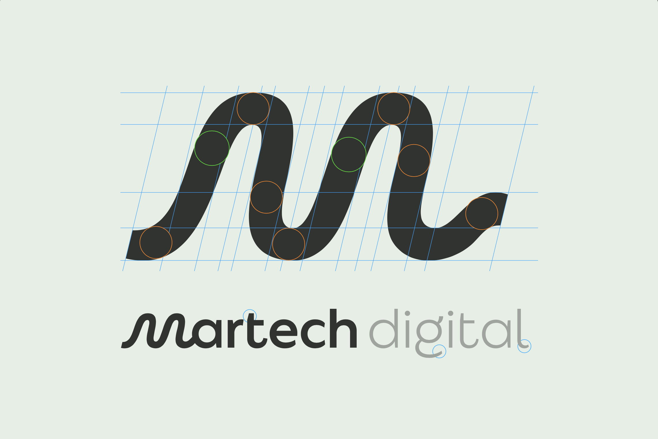 As curvas do desenho foram reinterpretadas para dar origem ao símbolo da marca: a letra “M” se desdobra em um traço contínuo, fluido e com curvas orgânicas, enquanto o “g” sorri e os ângulos personalizados reforçam a personalidade única da tipografia. Ao manter “martech” e “digital” do mesmo tamanho, mas com pesos e cores diferentes, equilibramos estratégia e tecnologia, solidez e leveza.