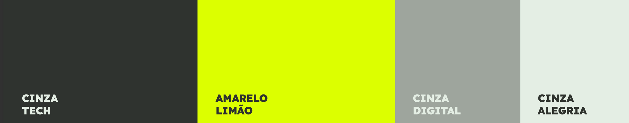 A antiga combinação de amarelo, cinza e roxo não sustentava a presença da marca. Por isso fizemos um movimento ousado: deixamos uma única cor vibrar. O amarelo‑limão — vibrante, alegre, energético — foi escolhido por fugir do óbvio. Essa cor evoca criatividade, com uma modernidade quase digital. Para sustentar esse brilho, tons de cinza entram como base, trazendo neutralidade, equilíbrio e solidez.